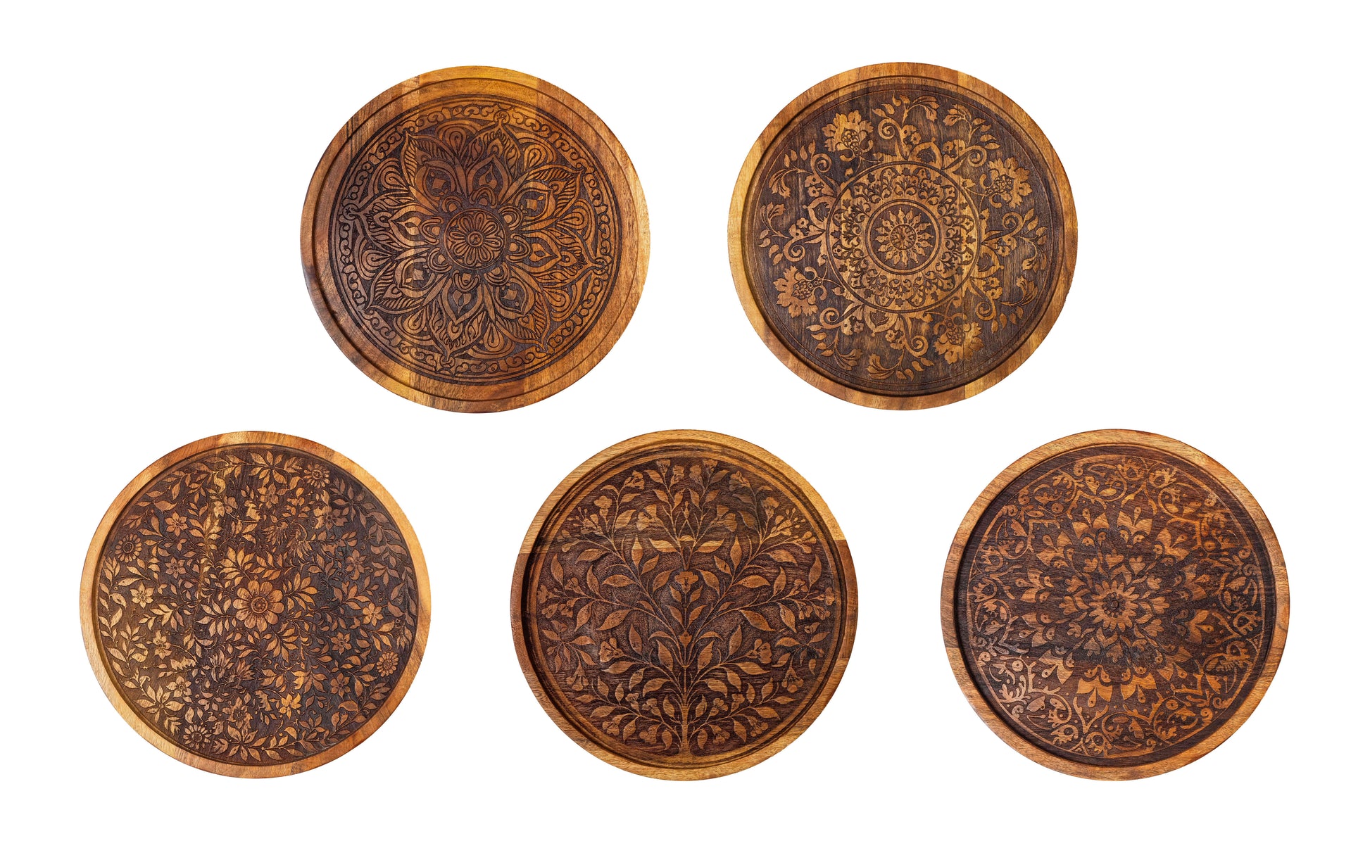 Handcrafted Acacia Wood Wall Art Set | Intricate Carved Floral Designs | Set of 5