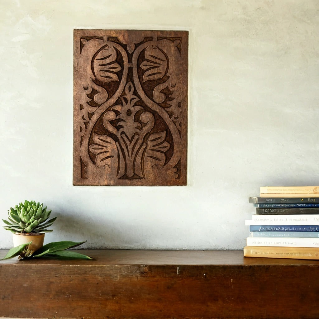 Add a touch of heritage and artistry to your space with this Ornate Hand-Carved Wooden Panel. Featuring an intricate floral-inspired motif, this engraved panel is a masterpiece of craftsmanship, meticulously carved by skilled artisans. Made from premium, responsibly sourced wood, its rich natural tones and detailed design make it an elegant addition to living rooms, bedrooms, offices, or entryways. Whether displayed as a standalone art piece or as part of a curated wall décor collection, this wooden panel brings warmth, character, and timeless beauty to any interior.