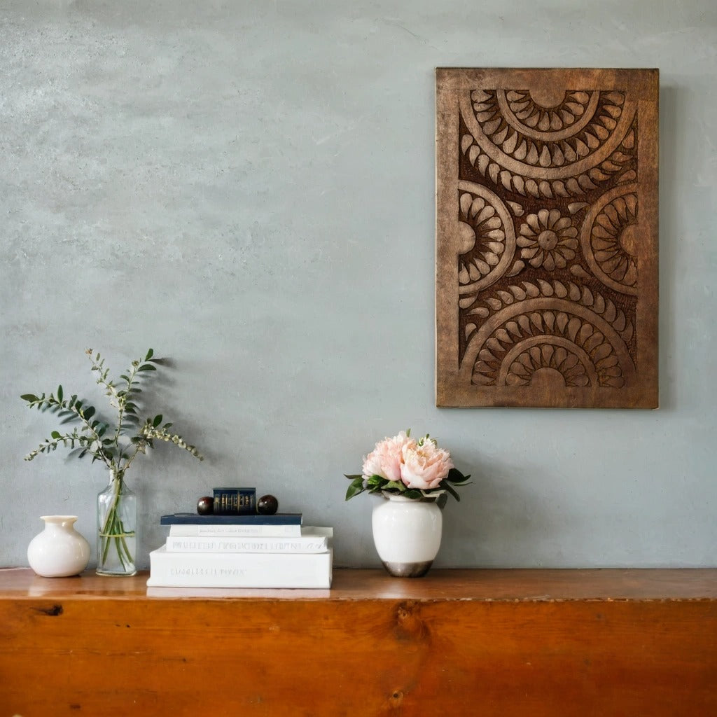 Add a touch of artisanal craftsmanship to your interiors with the Sunburst Heritage Wooden Panel. This handcrafted wooden panel features an exquisite sunburst motif, symbolizing warmth, positivity, and timeless elegance. Carved by skilled artisans, the intricate details and deep textures bring out the natural beauty of the high-quality wood. Its versatile design complements a variety of decor styles, including bohemian, rustic, and traditional interiors. Whether displayed as a statement wall piece or used as a decorative accent, this panel enhances any space with its refined aesthetics and cultural charm.